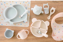 シリコーン食器は赤ちゃんの使いやすさを考えた設計で、ゾウ‧クマ‧ウサギのシルエットをモチーフにしており、やさしいベージュとグレーの2色展開。食器類全11アイテムと、バッグ類3アイテムをラインアップする。