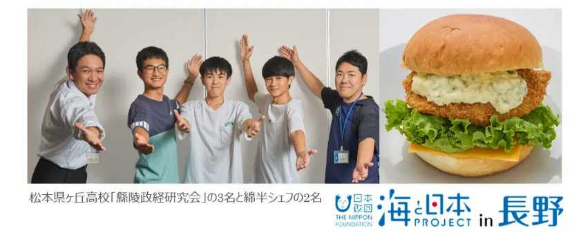 「能登ブリかがやきバーガー」は、(一社)海と日本プロジェクトが主宰する「海の政策コンテスト」で「最優秀賞」を受賞した、松本県ヶ丘高校の高校生と綿半シェフのコラボ企画によって誕生した商品。