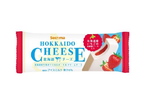 商品には北海道産生乳のマスカルポーネ・クリームチーズを使用。また、アイスの中には北海道産いちごの自家製いちごソースが入っている。チーズアイスのコクに甘酸っぱいいちごの酸味がマッチしたまるでデザートのようなアイスバー。価格は北海道では158円(本体価格、以下同)、茨城県・埼玉県では168円。