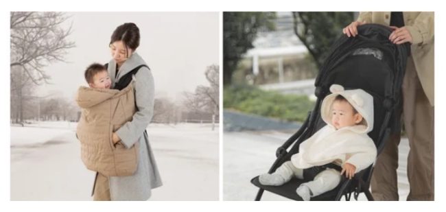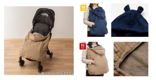 2025年秋冬モデルの「Nウォーム」おでかけベビーアイテムは、だっこ紐ブランケット・ベビーカーシート・フード付きポンチョなどをラインアップする。