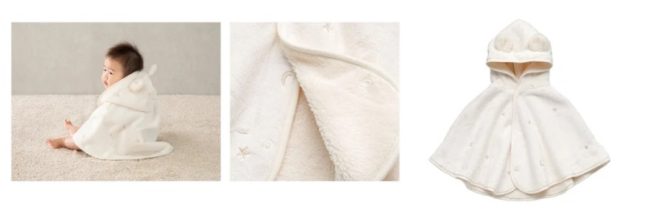 おでかけの時に赤ちゃんの上半身を包み込む、さっと羽織れる「フード付きポンチョ(NウォームWSP ST25)」は、内側は「Nウォームダブルスーパー」のボアで、クマ耳のフードやスタームーンの刺繍が施されてる。サイズは幅65cm×奥行38cm×高さ2cm、カラーはアイボリー、価格は2990円。