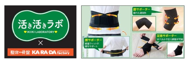 新製品は、カラダと健康の総合サロン「カラダファクトリー」とのコラボ商品となる。腰・骨盤・手首・肘・膝・足首など、気になる身体の部位をしっかりサポートする各種サポーターが登場する。