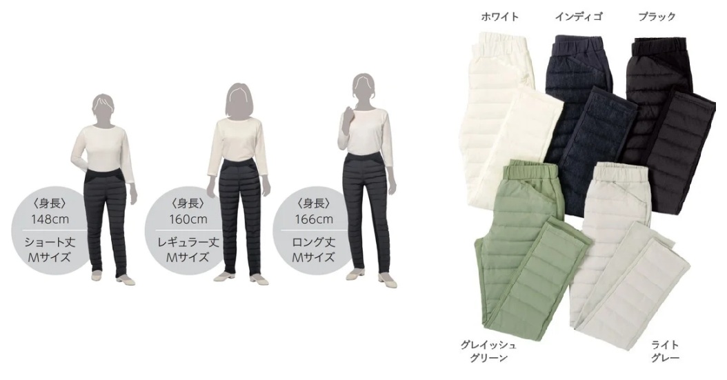 今季のダウンパンツは、昨年に続き定番のダウンパンツ、さらにあたたかい裏シャギーダウンパンツ、一番あたたかい前後両面ダウンパンツの3シリーズを揃える。レングスは、足元すっきりなショート丈・レギュラー丈・しっかり防寒できるロング丈の3種類。カラーは、今季追加されたグレイッシュグリーンを含め全5色を店頭で展開する。