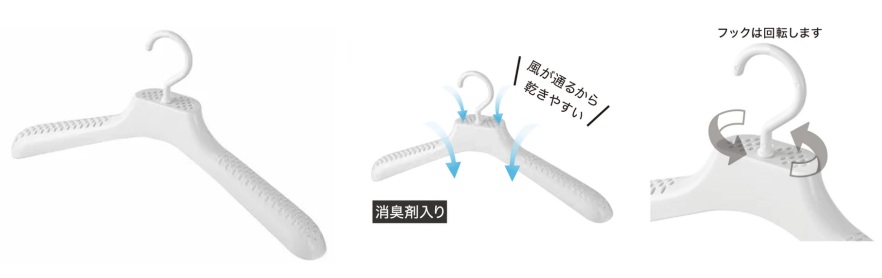 「乾きやすい消臭剤入りハンガー」は近年、増えている部屋干し・夜間干しをするときの洗濯物のにおいと乾きにくさに対応した。ハンガー本体の素材に消臭剤成分を配合し、干している間も洗濯物の嫌なにおいを抑制する。またハンガー本体は幅広で、穴が空いているため風通しが良く、洗濯物が乾きやすい構造となっている。3本セットで599円(税込価格、以下同)。