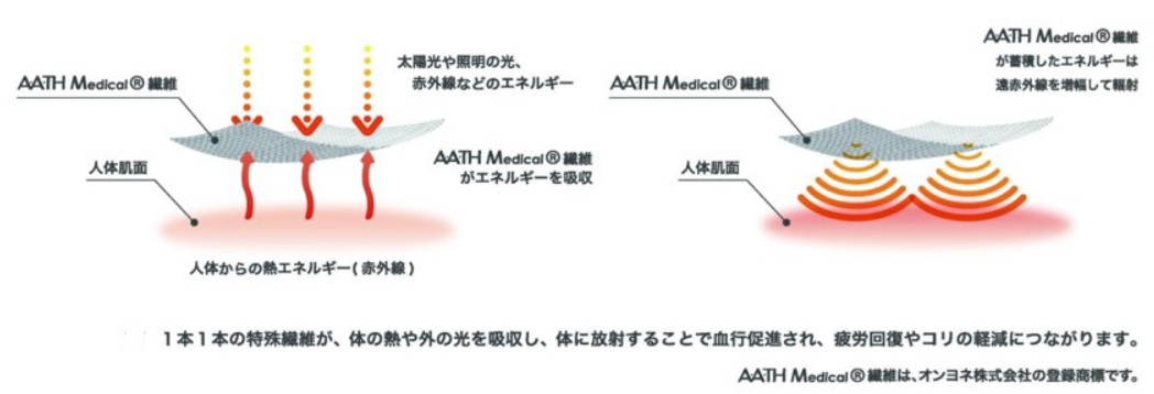 特長は2点。1つ目は、特殊繊維「A.A.TH Medical®繊維」の1本1本が、体の熱や外の光を吸収し、体に放射することで血行を促進され、着て寝るだけで疲労回復やコリの軽減につなげる。