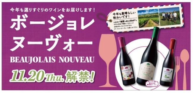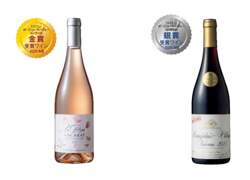 取り扱う商品は、今年公式コンクール「トロフェ・ボージョレ・ヌーヴォー」で金賞を受賞した「ラ・ローズ・ナカラ ボージョレ・ヌーヴォー・ロゼ」本体価格2980円(以下同)、銀賞を受賞した「カーヴ・デュ・シャトー・デ・ロージュ ボージョレ・ヴィラージュ・ヌーヴォー ノンフィルター」2980円が登場する。