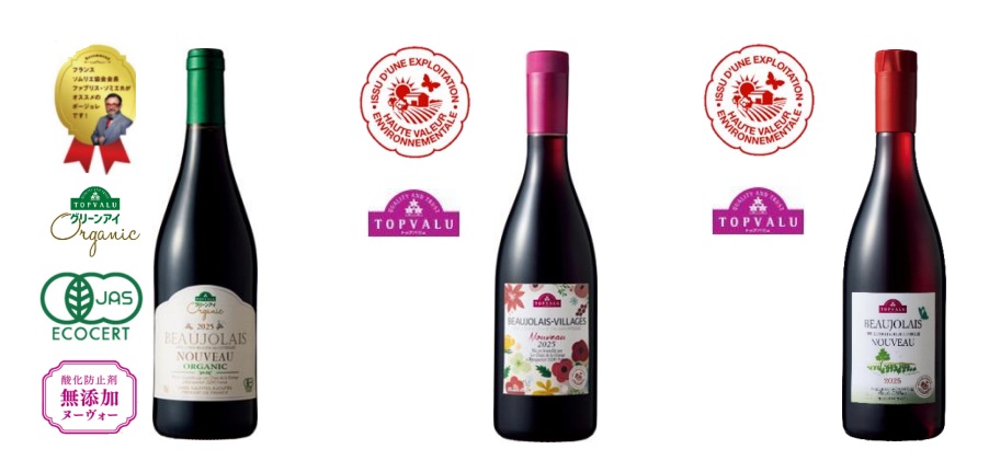 さらに「ジルベール&ガイヤール インターナショナルチャレンジ2025」で金賞を受賞した、「トップバリュ グリーンアイ オーガニック ボージョレ・ヌーヴォー(酸化防止剤無添加)」2680円、「トップバリュ ボージョレ・ヴィラージュ・ヌーヴォー PETボトル」1980円、「トップバリュ ボージョレ・ヌーヴォー PETボトル」1680円の3商品も取り扱う。
