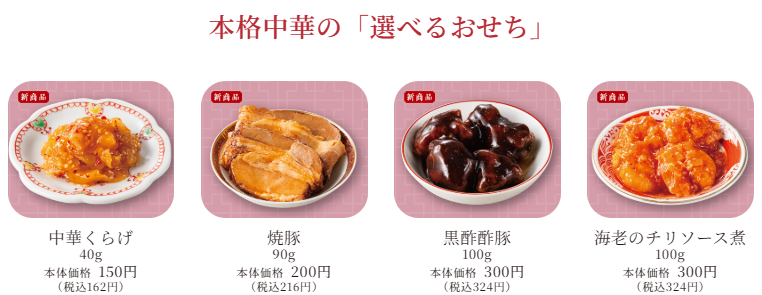 これまでも同社では例年、「100円おせち」や「少量パックおせち」などを展開してきたが、今年は和食だけでなく、洋食や中華の商品もラインアップに加わる。また定番の食材から高級料理まで幅広く揃える。