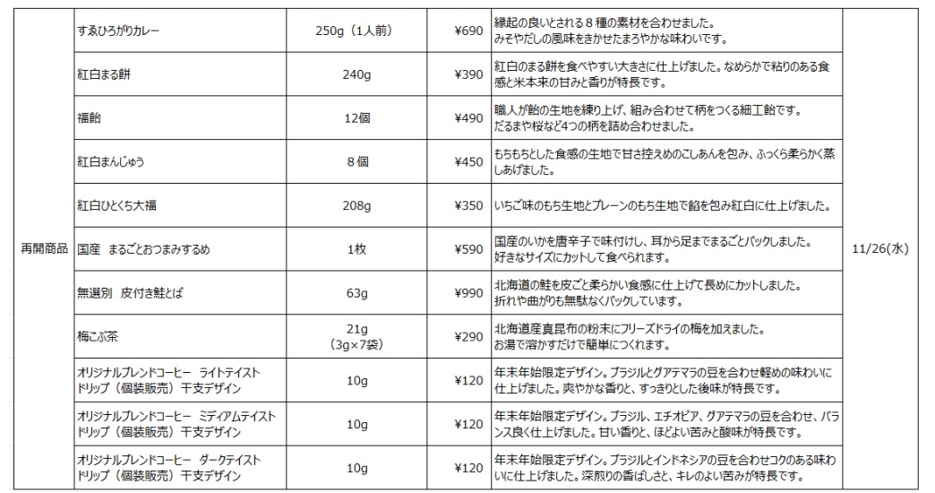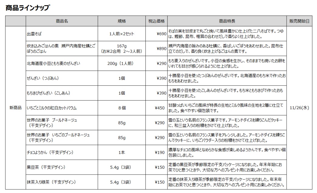 発売する商品は、年末年始にぴったりな「出雲そば」や「炊き込みごはんの素 瀬戸内海産牡蠣とごぼうのごはん」、「ぜんざい」、「いちごとミルクの紅白カットバウム」などの新商品を展開する。また、昨年好評だった「すゑひろがりカレー」や「福飴」、「紅白まんじゅう」なども発売する。