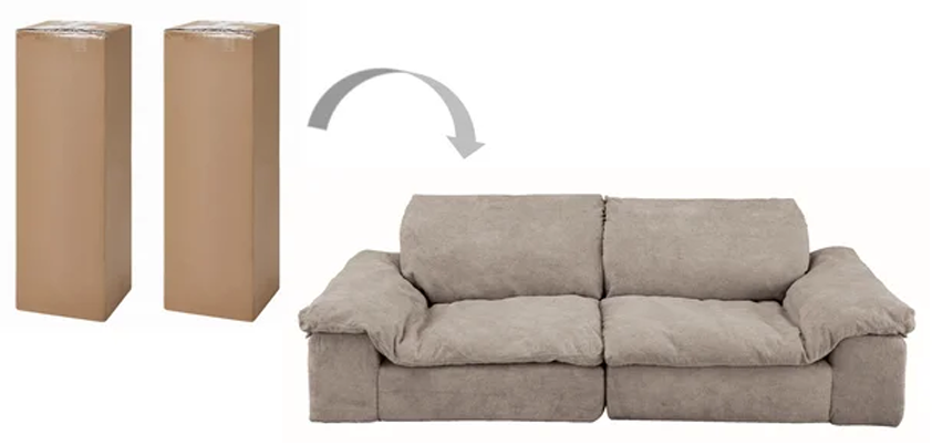 3人掛けソファはサイズが大きく、持ち帰りが困難なため、配送が前提だった。この課題を解決するため、圧縮梱包技術によりコンパクト化。家族や友人とゆったり座れる横幅222 cmのソファを3辺合計174cm×2梱包で持ち運びできるようにした。