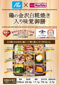 マックスバリュ北陸(株)(石川県金沢市、湊博昭社長)は、石川県と共同開発した弁当第二弾「鶏の金沢白糀焼き入り味覚御膳」を発売する。11月28日(金)からマックスバリュ20店舗で販売する。