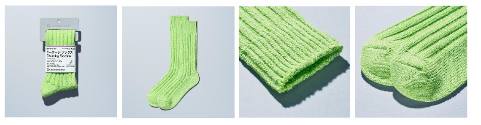 ローゲージソックスは、異なる種類の太めの糸を組み合わせ、まるで手編みのようにざっくりと編まれている。厚手素材なので暖かい。カラーはライムイエローミックス。価格は590円。