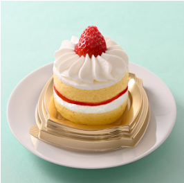 ふんわりとしたスポンジにコクのあるホイップクリーム、甘酸っぱいストロベリーソースといちごダイスを重ね、半分にカットした生のいちごを乗せた。498円。
