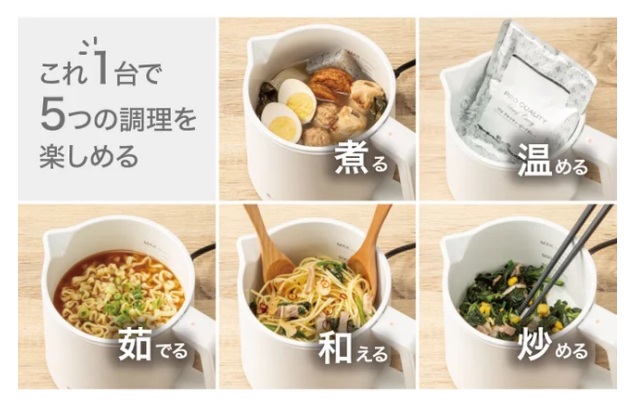 「1台5役おてがる調理ポット」は商品名の通り、煮る・温める・茹でる・和える・炒めるの5役が手軽に調理できる商品。加熱の強弱も切り替えられるので、さまざまな調理に活用できる。