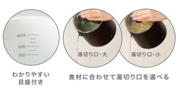 容器内側には300~800mLまで100mL単位で目盛りがついているので計量カップが不要。またふたには大小の湯切り穴がついているので、パスタや野菜を茹でた後にざるを用意する必要もなく、洗い物も減らせる。