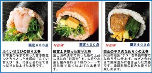 人気の “はみ出す太巻” シリーズには「はみ出す2種の海老の海鮮太巻」など2品目が加わる。海鮮系だけでなく、肉系、サラダ系、伝統の和風系まで、見た目も味もインパクト抜群の太巻を豊富に取り揃える。1本980円、ハーフ498円。