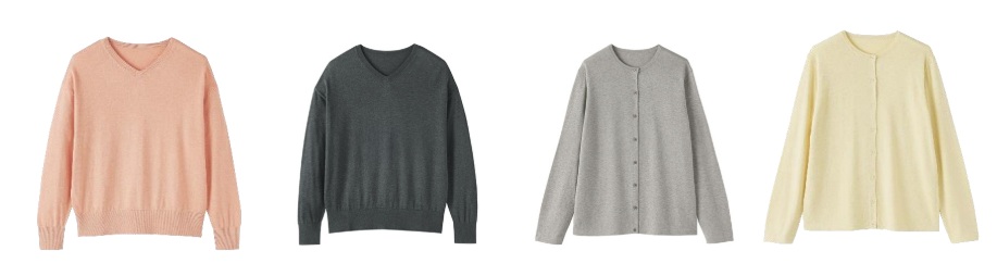 「婦人 大豆繊維を使ったⅤネックセーター」は、身幅にゆとりを持たせたリラックス感のあるドルマン型デザイン。カラーはグレー・ダークグレー・ピンク・ライトイエローの4色で、価格は3990円(税込価格、以下同)。「婦人 大豆繊維を使ったクルーネックカーディガン」は、ボタンを閉じて1枚着として着用することはもちろん、羽織りとして前あきで着こなすこともできるアイテム。カラーはグレー・ダークグレー・ライトイエローの3色で、価格は4990円。どちらもサイズはXS~XXL。