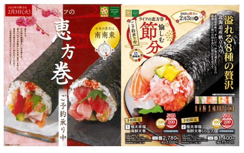 (株)ライフコーポレーション(東京本社:東京都品川区、大阪本社:大阪市淀川区、岩崎高治社長)は、2026年恵方巻の予約販売を開始した。今年は10月からサービスを開始した「ライフのオンラインストア」からも予約が可能だ。