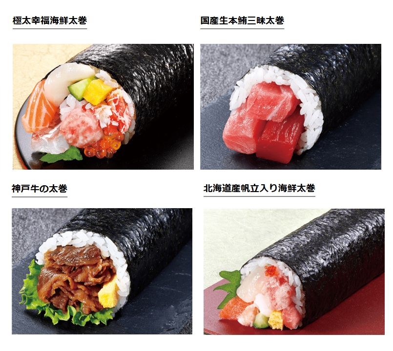 一方、首都圏の予約販売商品は、「極太幸福海鮮太巻」2780円、「国産生本鮪三昧太巻」2980円、「神戸牛の太巻」2480円、「北海道産帆立入り海鮮太巻」1580円など8種類を用意する。