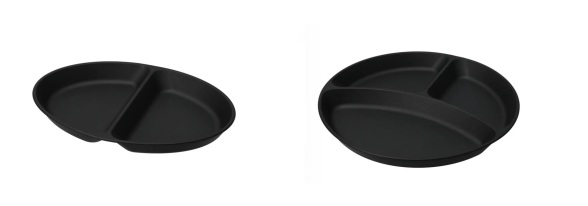 左「レンジでも器が熱くなりにくい樹脂食器 オーバルランチプレート」は、サイズが幅23×奥行16.5×高さ2.5cm。価格は799円。右「レンジでも器が熱くなりにくい樹脂食器 ラウンドランチプレート」は、サイズが幅25×奥行25×高さ2.5cm。価格は999円。どれもカラーはブラックのみ。