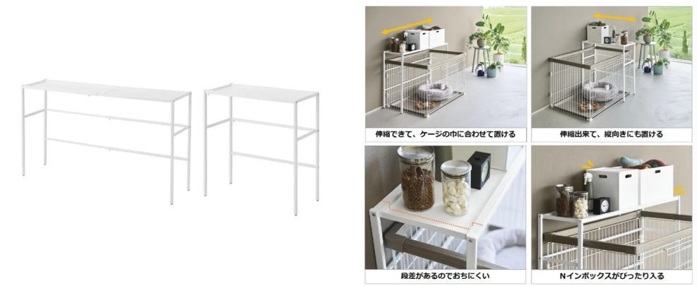 ペットケージの上部空間を活用できる専用収納ラック。幅は約70~128cmに伸縮できるので、今利用しているケージサイズに合わせて使用可能。ラック部分は、上に置いたものが落下しないようこぼれ止めを付け、ニトリの「バスケットNインボックス」がぴったり収まるサイズだ。サイズは幅70~128cm×奥行32.8cm×高さ72cm。価格は1万2990円(税込価格、以下同)。