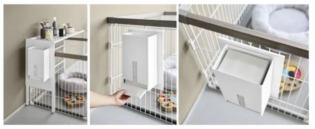 ペットを家族として迎えた人々から、トイレシーツやブラシ、おもちゃなど、物が増えてしまい置き場所に困っているという声が多いことから、ニトリではケージ上のデッドスペースに着目した収納商品を展開する。