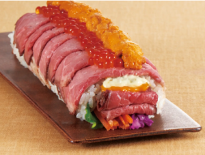 うにやいくらと楽しむ炭火焼ローストビーフ巻(1本2180円)は、精肉部門で販売している「ローストビーフ」を中にも外にもたっぷり盛り込み、「うに」や「北海道産いくら」をトッピングした贅沢な一品。