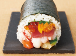 開運極太サミット巻(1本、本体価格3980円、以下同じ)は、本鮪「中トロ」「赤身」「北海道産いくら」「帆立」、縁起の良い「数の子」などを盛り込んだ、総重量約800g以上の豪華な海鮮恵方巻だ。