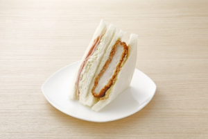 「ロースカツ&コールスローサンド」は、野菜や果実の旨味と甘さが特長のソースをまとわせたロースカツ・焼いた松波キャベツを挟んだ層に、爽やかな味わいのフレンチオニオンソースを和えた松波キャベツ入りコールスローサラダ・ハムを挟んだ層を組み合わせたサンドイッチ。価格は397円(税込み、以下同じ)。