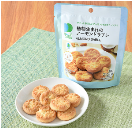 生地に豆乳を使用している。アーモンドとココナッツの香ばしさと食感がアクセントのサブレ。メープル香るやさしい甘さに仕上げた。189円(税込み、以下同じ)。