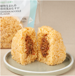 ラー油と胡麻の風味豊かなごはんに、甜面醤、豆板醤などの調味料で甘辛く味付けした大豆ミートをトッピングしたおむすび。価格は192円。