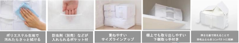 積み重ねできるカラーボックスや収納ボックス、1年中使えて収納に困らない寝具など「コンパクトな部屋でも、すっきりと効率よく暮らしたい」というニーズにぴったりの、収納アイテムや寝具などを提案する。布製収納シリーズは、外側がポリエステル生地の手入れが簡単な布製収納。軽いので上段にもしまいやすく、使わない時はコンパクトに畳める。Sが1628円、Mが2178円。