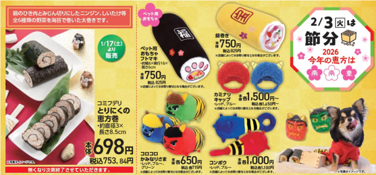 2月3日(火)の節分に向けては、ワンちゃんと無病息災を願う「ペット用恵方巻」を販売する。
