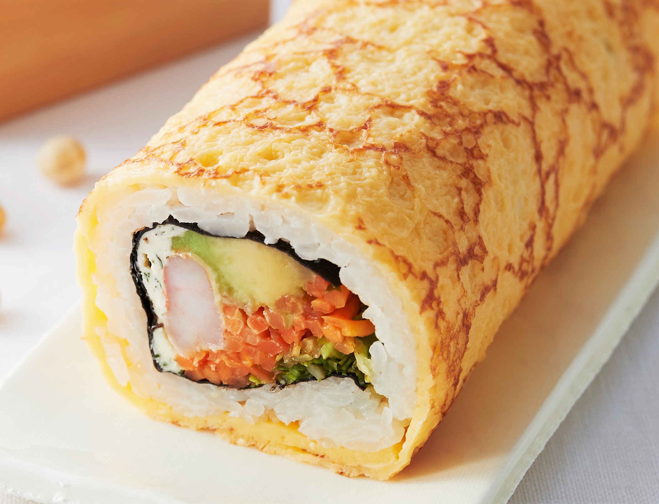 「野菜と愉しむ 海老とアボカドの福恵方巻き」は1本1670円、ハーフ1本880円。海老・アボカド・クリームチーズを、甘みのあるふんわりした薄焼き玉子で包んだ。千切りにした生野菜と人参のナムルも加え、野菜の食感を活かした恵方巻だ。