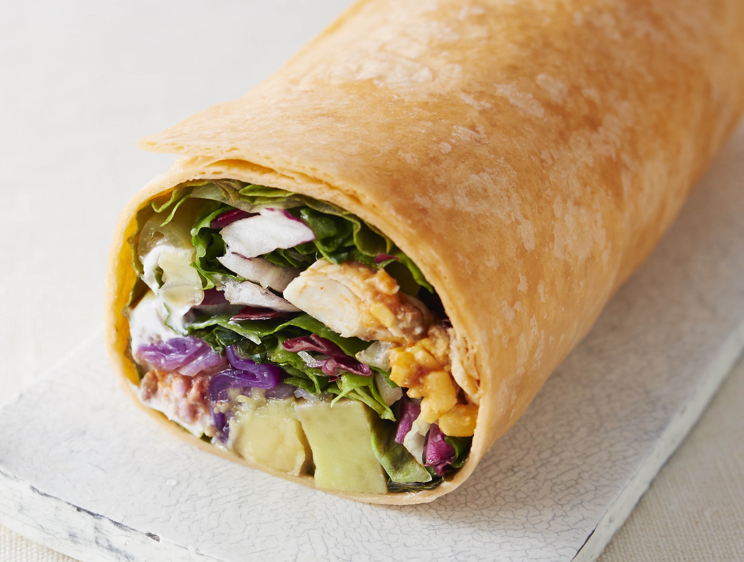 トルティーヤを使った、サラダ感覚の恵方巻き。タコスソースで野菜をおいしく味わえる。レッドキャベツのマリネが食感のアクセントになっている。