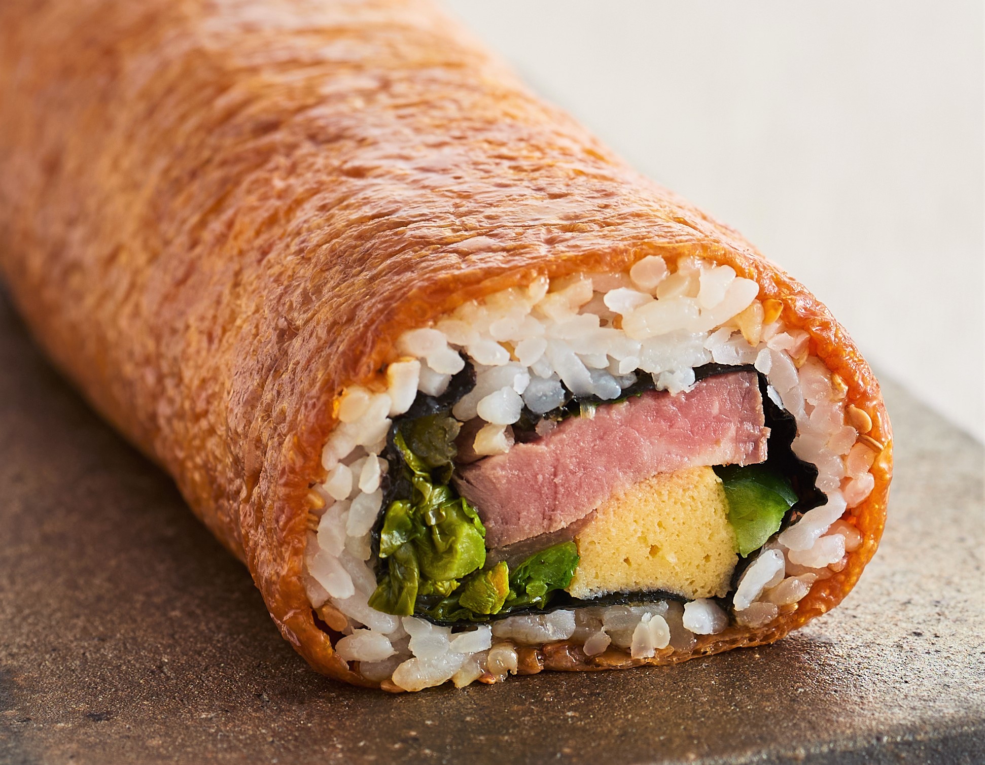 日本のさらだ いとはん、グリーン・グルメで販売するのは、「ローストビーフと菜の花のいなり恵方巻き」。1本1980円、ハーフ1本1030円。山椒の香りをまとわせて香ばしく炙ったローストビーフに菜の花、カステラ玉子焼き、かんぴょう、きゅうりを合わせている。甘く炊いた揚げで巻いた恵方巻き。