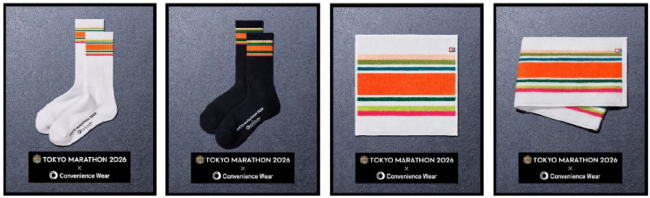 また、ファミマオンラインでは数量限定で予約受付を開始する。東京マラソンとの初のコラボレーションアイテムでは、今年の東京マラソンを象徴するカラーリングを取り入れ、東京の街や大会期間の高揚感を日常の中で楽しめるデザインに仕上げた。発売アイテムはラインソックス(546円 税抜 以下同)。東京都ではタオルハンカチ(728円)・マフラータオル(1364円)をラインアップする。快適な使い心地とファッション性を兼ね備え、スポーツイベントを文化として楽しむ新たなスタイルを提案する。