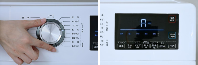 - ドラム式には珍しいダイヤル式操作を採用。一般的なドラム式洗濯機はタッチボタン操作が主流で、目的のコースになるまで何度もボタンを押して設定するタイプが多い。本商品は液晶パネルとダイヤル式を組み合わせ直感的操作が可能になった。