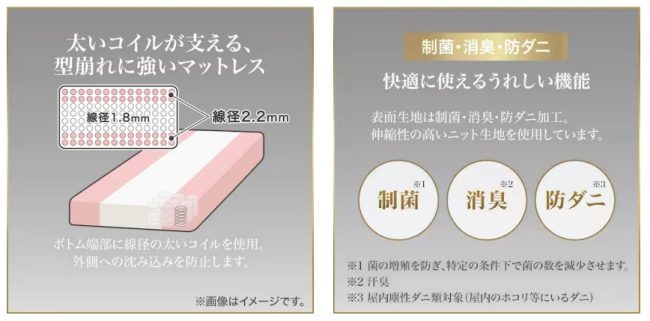 マットレスの端部の落ち込みを抑える「エッジサポート機能」を追加。防ダニ加工は継続して採用し、抗菌加工は菌の増殖を防ぎ、特定の条件下で菌の数を減少する制菌加工へグレードアップする。また防臭加工も汗臭を分解・緩和する消臭可能へグレードアップする。さらに吸放湿性に優れた綿を使用することで、マットレス内部に湿気をためにくい仕様に変更する。