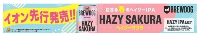 イオンリカー(株)(千葉県千葉市、吉澤研二社長)は 2月3日(火)から、英国の人気クラフトビールメーカーBREWDOG(ブリュードッグ)の新商品「HAZY SAKURA(ヘイジーサクラ)」を、本州・四国・九州の「イオン」「イオンスタイル」「イオンリカー」約300店舗で先行発売する。