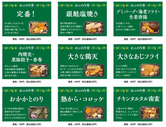 「選べるのり弁」では、ごはんに新潟県産コシヒカリ「粒ぞろい」を使用、のりの下には香り豊かな国産鰹の削り節を敷くことで、のり弁の本質である「のり・米・だし」の調和を追求した。おかかとのりだけのシンプルな商品から、ボリュームのあるガッツリ系の商品まで幅広く取り揃える。価格帯も本体価格199円からと、手頃なものから少し贅沢なものまで、多様なニーズに対応したラインアップとなる。
