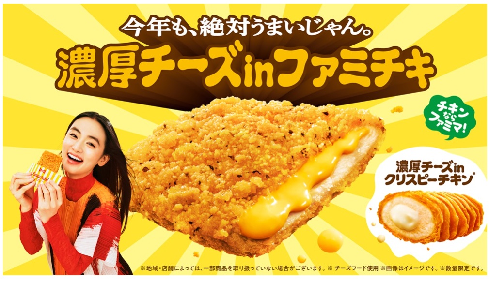 また、3種のチーズを使用し濃厚かつとろり食感と、カリッと衣の食感を楽しめる「濃厚チーズinクリスピーチキン」も同時発売する。昨年はクリームチーズソースを使用した「クリームチーズソースinクリスピーチキン」を展開したが、今年はファミチキ同様、さらに濃厚な味わいを目指して開発している。価格は184円。