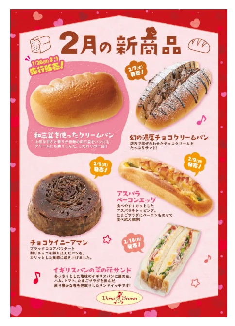 そのほか2月の新商品としては、「和三盆を使ったクリームパン」198円、「幻の濃厚チョコクリームパン」198円、「チョコクイニーアマン」158円、「アスパラベーコンエッグ」198円なども発売している。