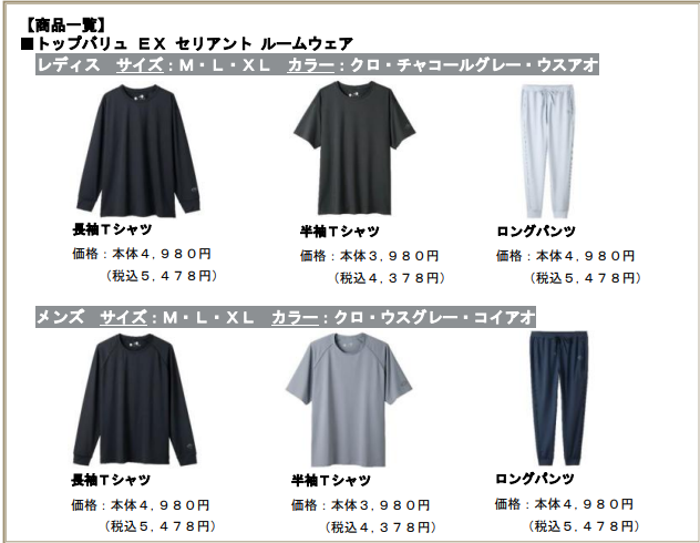 「EXセリアント」はリカバリーウェアとして遠赤外線の血行促進作用により疲労回復効果が期待できる。今回、インナーに加えて、レディスとメンズのルームウェアを新たに展開する。どちらもゆったりとしたサイズに設計し、ロングパンツはポケット付きで動きやすいように裾を少し絞ったデザインとした。インナーと同様、身生地にリサイクルポリエステルを40%使用し、サステナブルなリカバリーウェアとして商品化している。