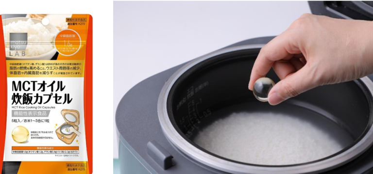 そこで「matsukiyo LAB」は、健康サポート成分として注目されるMCTオイル配合の炊飯カプセルを開発した。炊飯時にこのカプセルを加えるだけで、中鎖脂肪酸 (オクタン酸、デカン酸) の機能により BMI が高めの人の日常活動時の脂肪燃焼を高めるとともに、米の乾燥を抑え、炊き上がり後時間が経っても米のおいしさが持続する。計量不要のカプセルタイプで、手軽に取り入れることができる。