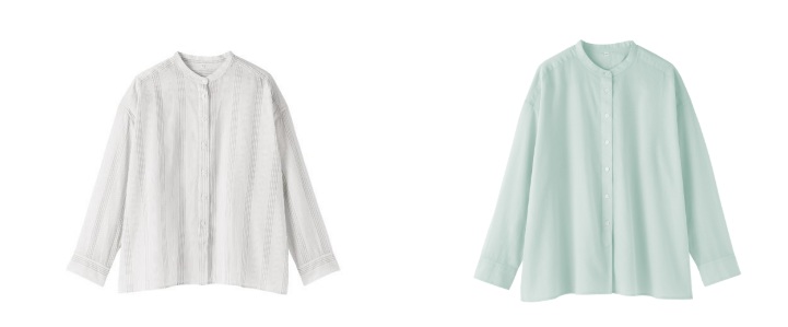 透け感のある素材で仕立て、軽やかな着心地が特長のスタンドカラーの長袖シャツ。カラーはオフ白ストライプ・ライトブルー・チャコールグレー・黒の4色、価格は3990円(税込価格、以下同)。