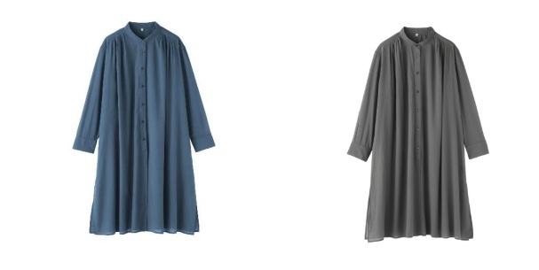 ゆったりと裾に向かって広がるシルエットでサイドスリットが入っているためどんなボトムにも合わせやすいデザインのシャツワンピース。カラーはスモーキーブルー・チャコールグレー・黒の3色で、価格は5990円。