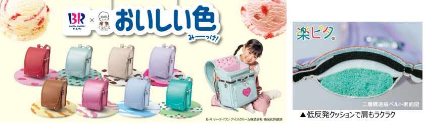 「くるピタ®サーティワン」シリーズは、簡単な開け閉めが特徴で、0.2秒でフタが閉まる「くるピタ®」錠前が採用されている。肩ベルトに荷物の重さを分散する厚さ10㎜の低反発クッション仕様「楽ピタ®」 で体への負担を軽減する。「サーティワン」の人気アイスクリームをイメージした全8色を展開。価格は6万3000円。