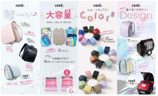 イオンは2001年に業界初となる「24色ランドセル」を発売し、色の選択肢を広げた。現在は新しい通学スタイルとしてリュックタイプ「かるすぽ ラクルスタイル」も販売。2027年新入学生向けでは、子供の好みに合うように色やデザインの選択肢をさらに広げている。その特徴は下記の通り。