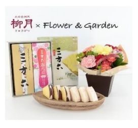 「スイーツセットアレンジメント フラワー「オアシス」」は、柳月代表銘菓「三方六」のプレーン味と期間限定の「春がさね」の詰め合わせとカーネーションのアレンジメントのセット 。価格は5000円。